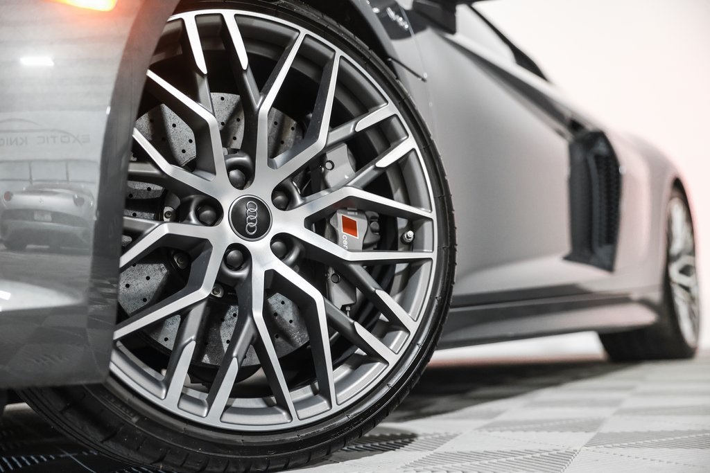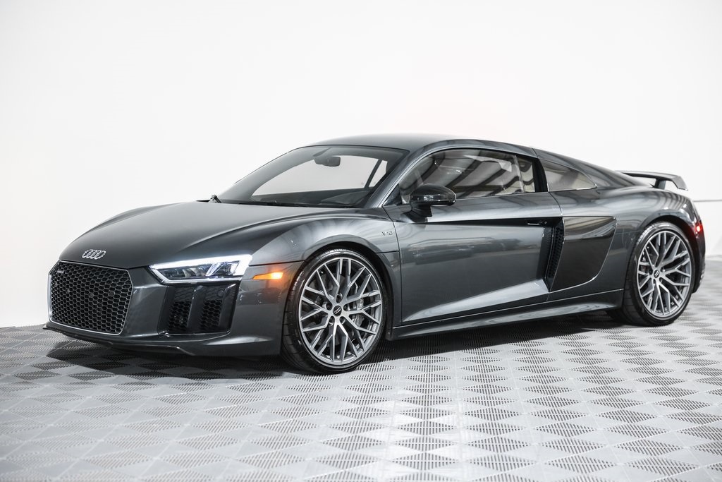 Clean CARFAX. Daytona Gray Pearl Effect 2017 Audi R8 5.2 Plus quattro quattro 7-Speed Automatic S tronic 5.2L V10 FSI DOHC Plus Black Leather, 4-Wheel Disc Brakes, 5 Speakers, ABS brakes, Air Conditioning, Alloy wheels, AM/FM radio, Auto High-beam Headlights, Auto-dimming door mirrors, Auto-dimming Rear-View mirror, Automatic temperature control, Brake assist, Bumpers: body-color, Ceramic disc brakes: front and rear, Compass, Delay-off headlights, Driver door bin, Driver vanity mirror, Dual front impact airbags, Dual front side impact airbags, Electronic Stability Control, Exterior Parking Camera Rear, Fine Nappa Leather Seat Trim, Four wheel independent suspension, Front anti-roll bar, Front Bucket Seats, Front Center Armrest, Front fog lights, Front reading lights, Fully automatic headlights, Garage door transmitter: HomeLink, Heated door mirrors, Heated Front Racing Shell Sports Bucket, Heated front seats, Illuminated entry, Knee airbag, Low tire pressure warning, Navigation System, Occupant sensing airbag, Outside temperature display, Overhead airbag, Panic alarm, Passenger door bin, Passenger vanity mirror, Power door mirrors, Power driver seat, Power passenger seat, Power steering, Power windows, Radio data system, Radio: Audi MMI Navigation Plus, Rain sensing wipers, Rear anti-roll bar, Rear fog lights, Rear window defroster, Remote CD player, Remote keyless entry, Security system, Speed control, Speed-Sensitive Wipers, Spoiler, Sport steering wheel, Steering wheel mounted audio controls, Tachometer, Telescoping steering wheel, Tilt steering wheel, Traction control, Trip computer, Turn signal indicator mirrors, Variably intermittent wipers, Voltmeter, Wheels: 19" 5-Double-Spoke Design Forged.Recent Arrival! Odometer is 9584 miles below market average!