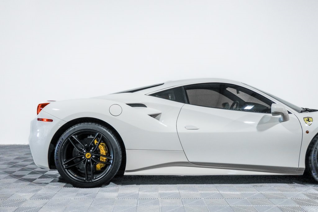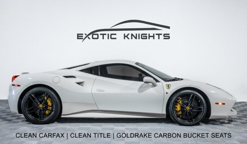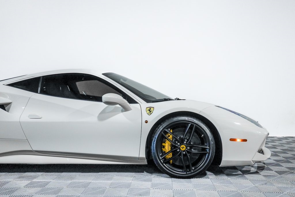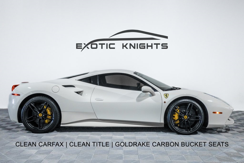 Clean CARFAX. Bianco Avus 2016 Ferrari 488 GTB Base RWD 7-Speed Automatic V8 4-Wheel Disc Brakes, 6 Speakers, ABS brakes, Adaptive suspension, Air Conditioning, AM/FM radio, Apple CarPlay, Automatic temperature control, Brake assist, Bumpers: body-color, Ceramic disc brakes: front and rear, Compass, Delay-off headlights, Driver door bin, Dual front impact airbags, Dual front side impact airbags, Electronic Stability Control, Four wheel independent suspension, Front anti-roll bar, Front Bucket Seats, Front Center Armrest, Front dual zone A/C, Front reading lights, Fully automatic headlights, Goldrake Carbon Fiber Racing Seats, Headlight cleaning, Heated door mirrors, Illuminated entry, Leather Seat Trim, Leather steering wheel, Low tire pressure warning, Outside temperature display, Passenger cancellable airbag, Passenger door bin, Power door mirrors, Power steering, Power windows, Radio data system, Radio: AM/FM/MP3/USB/6-Disc CD w/30GB Hard Disc Drive, Rear anti-roll bar, Rear fog lights, Rear Parking Sensors, Rear window defroster, Remote keyless entry, Security system, Speed-sensing steering, Spoiler, Sport Bucket Seats, Sport steering wheel, Steering wheel mounted audio controls, Tachometer, Telescoping steering wheel, Tilt steering wheel, Traction control, Trip computer, Voltmeter.Recent Arrival!