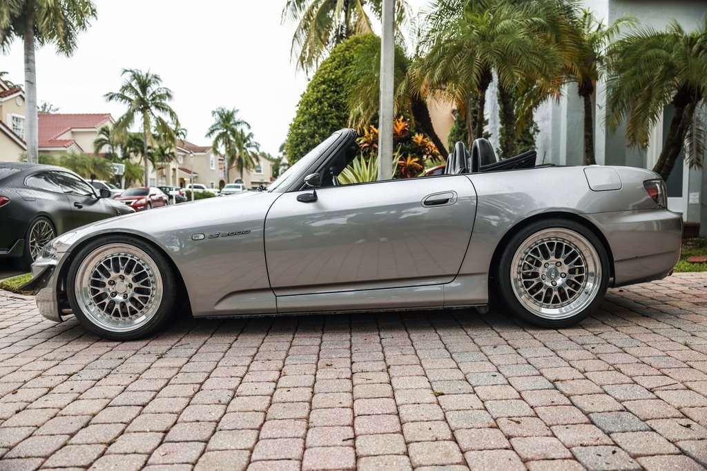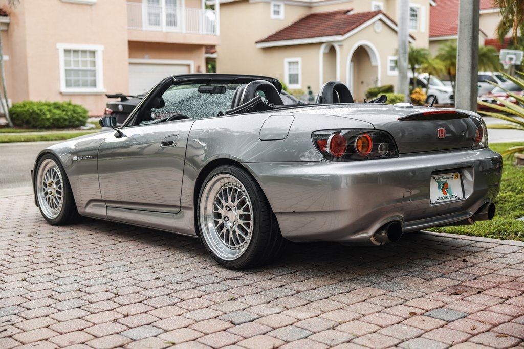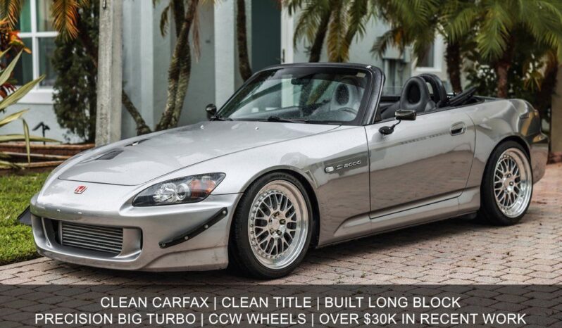 2005 Honda S2000 Ap2CCW Wheels (18x9 +64 and 18x10.5 +70)Inline Pro built long block (10:1 compression, stage 2.5x cylinder head)58/58 Precision TurboAEM Series 2 EMSTwin Scroll ManifoldID 1000 injectorsWalbro 450 fuel pumpAEM Fuel Sensor E85 ready (with tune)Manual Transmission replaced at 135k with one with 60kAEM Wideband GaugeTiAl 38mm WastegateHKS SS Blow off valve Dual Core RadiatorMishimoto Racing ThermostatMegan Engine and Diff mountsEibach springs Koni yellow shocks and strutsAPR Carbon Fiber Mirrors and CanardsTuned conservatively at 500whpClean CARFAX. Silverstone Metallic 2005 Honda S2000 Base RWD 6-Speed Manual with Overdrive 2.2L I4 DOHC VTEC 16V 4 Speakers, 4-Wheel Disc Brakes, ABS brakes, Air Conditioning, AM/FM radio, AM/FM/XM-Ready/CD Audio System w/4 Speakers, Bucket Seats, Bumpers: body-color, CD player, Convertible roof wind blocker, Driver door bin, Dual front impact airbags, Four wheel independent suspension, Front anti-roll bar, Front Bucket Seats, Front reading lights, Glass rear window, High-Intensity Discharge Headlights, Illuminated entry, Integrated roll-over protection, Leather Seat Trim, Leather Shift Knob, Leather steering wheel, Panic alarm, Passenger vanity mirror, Power convertible roof, Power door mirrors, Power steering, Power windows, Rear anti-roll bar, Rear window defroster, Remote keyless entry, Speed control, Speed-sensing steering, Tachometer.Recent Arrival!
